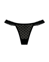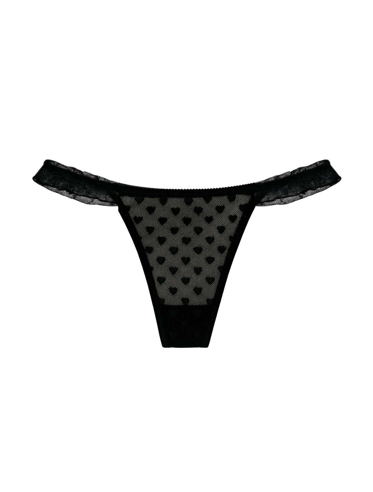 Fall in love with the details—this sheer black thong features a delicate mesh with a playful heart pattern and soft frilly straps along the hips. Lightweight, flattering, and effortlessly flirty, it’s a must-have for when you want lingerie that feels as fun as it looks.