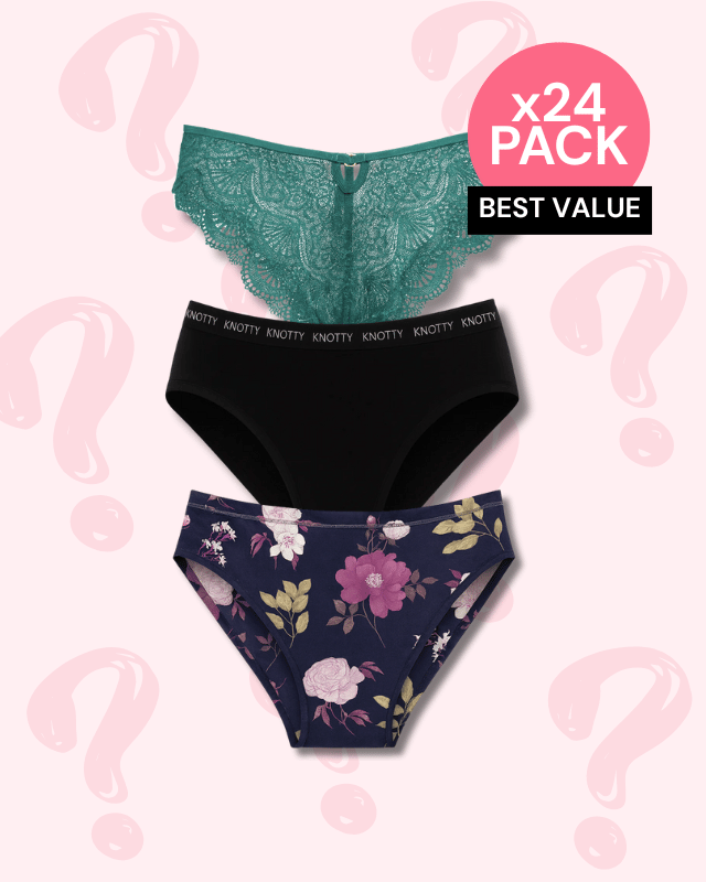Our Mystery 24-Pack includes 24 of our best-selling non-thong underwear styles in a curated selection. You place the order, we do the picking—easy, fun, and totally unexpected.
