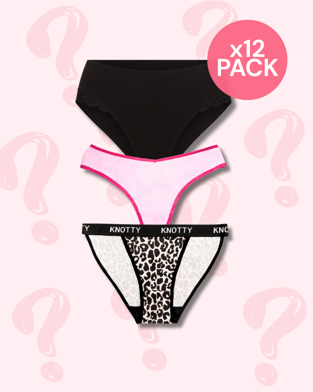 Each pack is a surprise assortment, so styles may vary from the images shown. Mystery bundles include a mix of silhouettes, with no guaranteed ratio between thongs and non-thongs. That’s part of the magic ✨