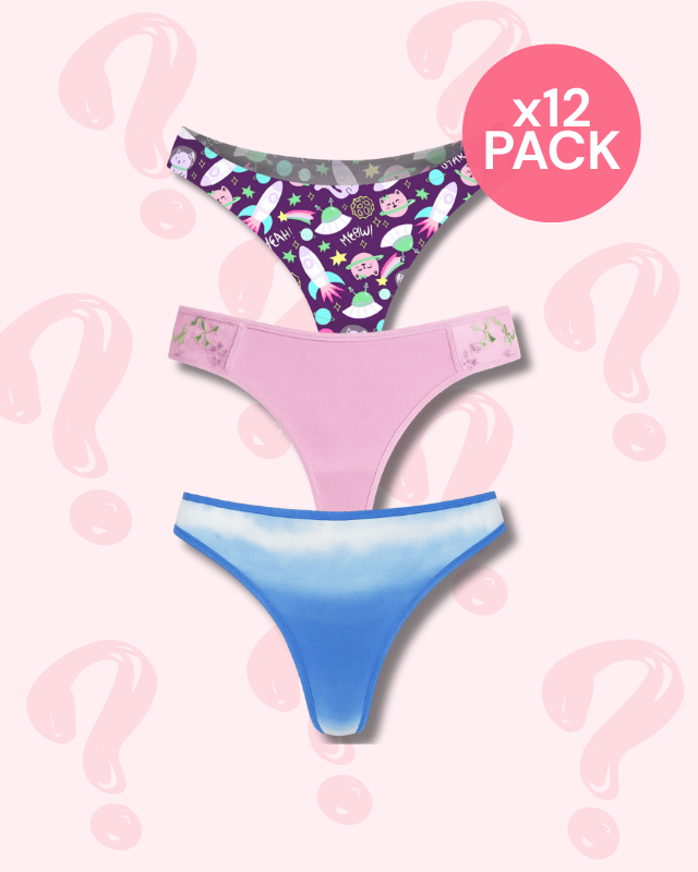 Each pack is a surprise assortment, so styles may vary from the images shown. Mystery bundles include a mix of silhouettes, with no guaranteed ratio between thong and g-string styles. That’s part of the magic ✨